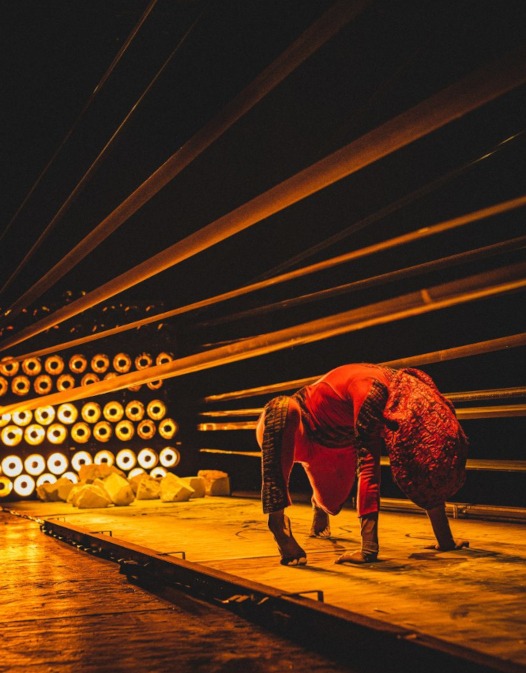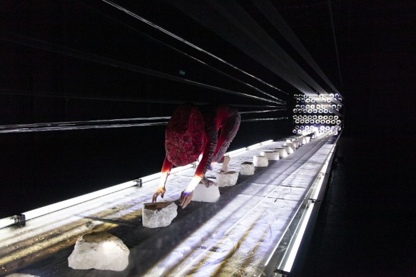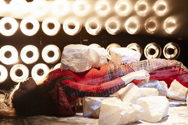 L’un des prismes de mes pièces est d’interroger une force poétique. Dans la création, j’évolue avec vingt‐trois blocs inégaux d’albâtre de dix kilos et cent‐cinquante autres kilos de plus petites pierres du même matériau. Les blocs peuvent ainsi prendre la forme d’un mur à trois colonnes. Puis s’écrouler avant de dessiner un chemin. Mais c’est le corps à corps avec la pierre qui permet de réaliser les métamorphoses entre ruines et tour éphémère, par exemple. Que l’on songe ainsi à la sensualité de la chair des statues.