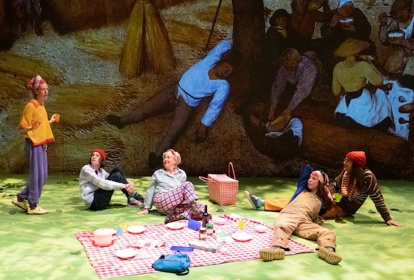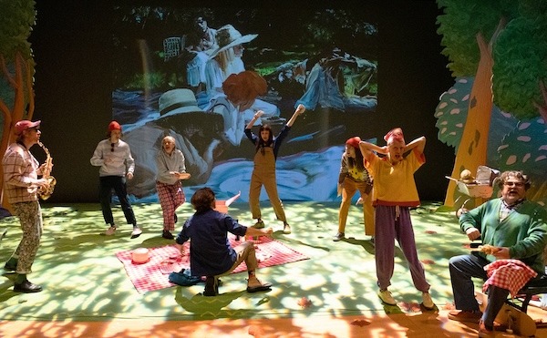 Un parc public, peint. C’est important que le décor soit peint. Et au milieu, derrière les bancs et le plan herbeux, un grand écran sur lequel les toiles vont être convoquées. Pas toutes, mais la plupart. Clairement, un tel spectacle dans lequel nous ne montrerions pas les toiles serait une torture!