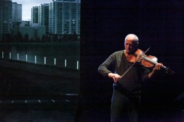 Qu’en est-il du suspens sous le calme visible de l’image?Alexandre Simon: Nous composons d’abord une partition écrite et de morceaux de musique. Elle est constituée de bribes de texte, de séquences filmées et d’idées de mise en scène. Nous la modifions ensuite au fil du processus de création. Dans cette pièce, nous sommes attachés à une certaine lenteur, un déploiement du temps qui permet la contemplation, d’où cette ouverture accompagnée du Nocturne de Saariaho interprété par Hans Egidi, qui introduit le public dans un temps méditatif.