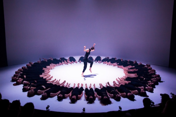 Colossus pose d’abord une communauté de corps étendus en cercle tel l’iris d’un immense œil. Des vagues de mouvements évoquant une pupille respirante s’ouvrent et se ferment. Puis une danseuse se dégage au centre du motif solaire ou corallien. Voyez-là maintenant tournoyer en animant les corps de la communauté d’un geste, telle une cheffe d’orchestre. Mais elle se révèlera bien vitre engloutie par la masse. Se dessine aussi ponctuellement une forme de révolte à travers une transe pulsionnelle. Rencontre avec la chorégraphe Stephanie Lake.