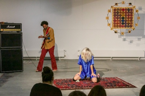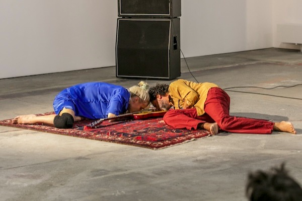 En ouverture de soirée, le pas de deux à la fois chanté, joué et chorégraphié déjà créé avec la danseuse Cosima Grand, Pleased to meet you. L’interconnexion avec le musicien se cristallise d’abord autour du corps même de la guitare électrique. La voici longuement embrassée, transfigurée, réverbérée. Au sol et en tensions, la danseuse cisèle un balancement hypnotique pouvant s’inspirer librement notamment d’une œuvre sculptée du musicien à base de géométrie constructive et ludique.