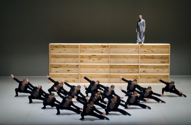 Conçue par le plasticien Antony Gormley, la scénographie est intimement liée à la danse. Elle aligne dix-huit coffrages en bois. Ces éléments mobiles s’inscrivent dans une scénographie dynamique, agissante. On voit alors surgir tour à tour forêts, murs ou antiques cités.