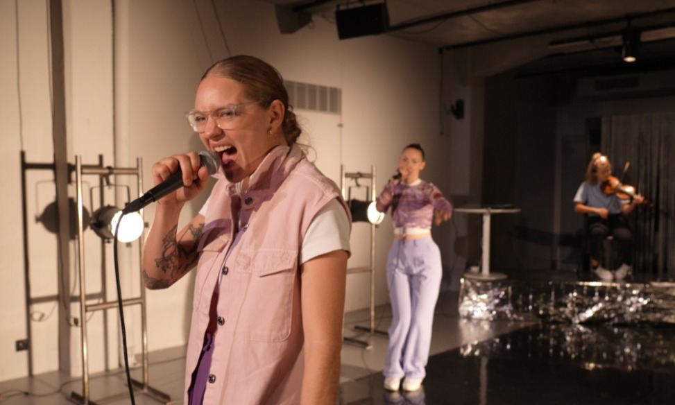 Le décor évoque plutôt un concert, pour laisser le texte et la musique porter la dureté de cet environnement. Les trois musiciennes constamment présentes sur scène, les comédiennes, presque. Nous voulions un espace fluide, non réaliste, fidèle au rythme du texte.