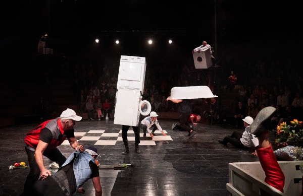C’est toujours un jeu complexe d’équilibriste entre rire et ici, par exemple, des courses-poursuites aux ressorts burlesques et comiques. Cela reste dans sa mission et son esprit, un spectacle pour enfants et intergénérationnel voulu fédérateur. Les acrobates font du cirque sous chapiteau. Et, partant, du spectacle familial.