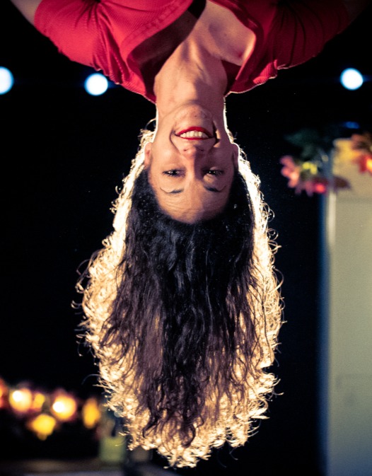 Le spectacle débute par une femme solitaire faisant face à un groupe d’hommes. Ils se révèleront essentiellement les porteurs de l’histoire pour le personnage acrobate que j’interprète. D’emblée, Il y a ainsi la volonté d’attraper le public en lui donnant une émotion saisissante. Si cette femme se retrouve poursuivie, traquée, cette lecture d’une destinée périlleuse sera comme lissée et polie au fil du spectacle. On ne sait d’ailleurs si ces hommes qui la poursuivent sont ses démons, le fruit de son imagination ou la violence que peut subir la femme sous le regard de l’homme.