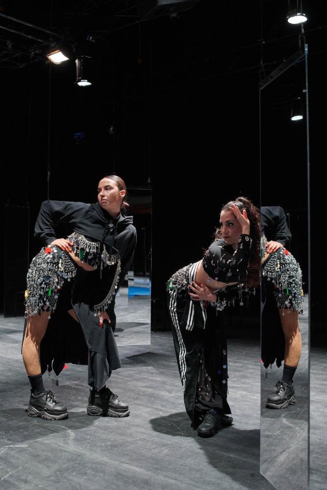 Cette enquête parlée-dansée est déposée dans une forêt de miroirs flottants qui déréalisent l’espace.