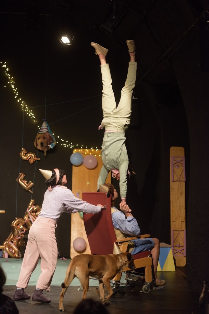Ce spectacle met en scène un homme, deux femmes et un chien pros de l’impro qui s’encanaillent un lendemain de fête.
