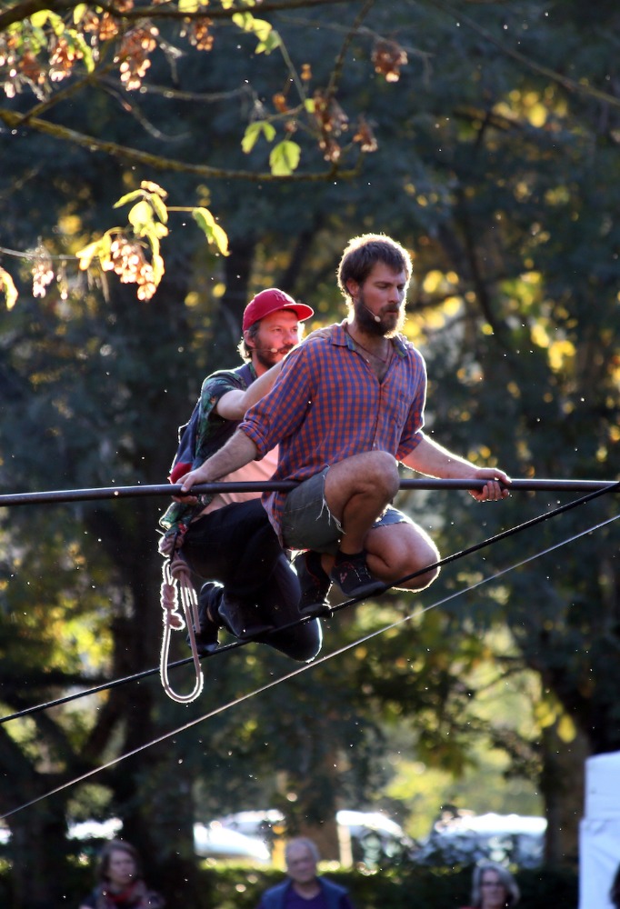 Partagés autour d’un feu de camp, quelques pop-corn suffisent à nous embarquer dans la singulière ascension funambule des deux compères. Départ au niveau du sol pour arriver à dix mètres de haut. Un cap à franchir à l’aide d’un balancier, pas à pas.