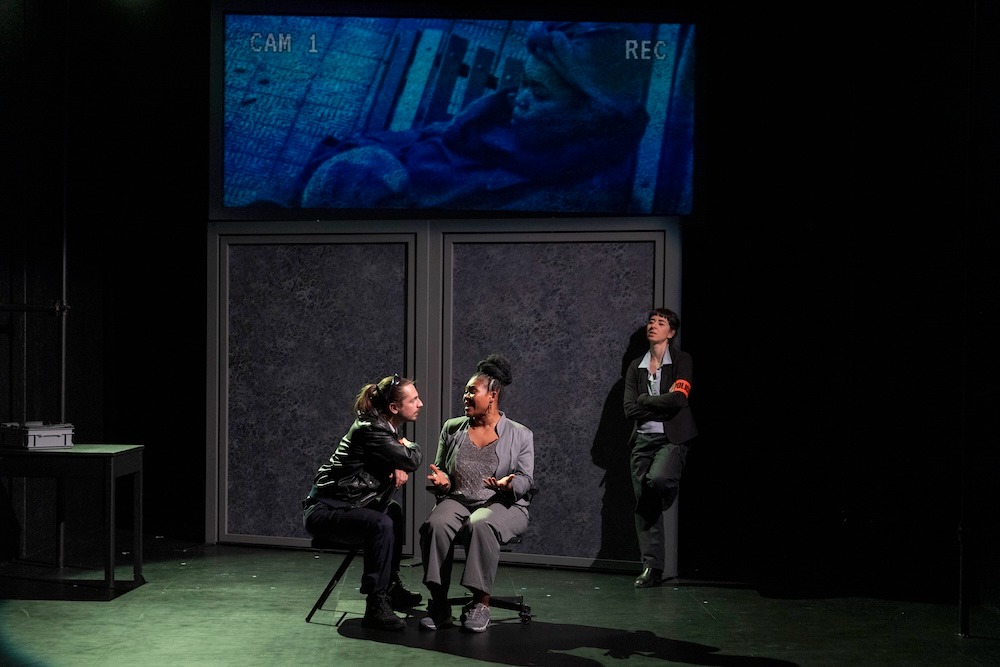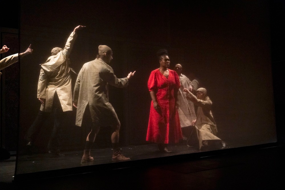 Evelyne Castellino malaxe cette matière en alliant vidéo, mouvements chorégraphiques et voix chorales pour composer un conte scénique frisant la dystopie, dans lequel la vidéosurveillance est omniprésente.