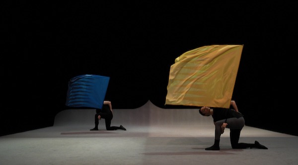 Les deux couleurs jaune et bleu qu’affichent les drapeaux manipulés et dansé par le binôme dansant remontent à la période médiévale tout en ne faisant pas intentionnellement référence à la résistance ukrainienne, la pièce ayant été créée avant l’invasion russe de février 2022. Une dimension guerrière donc. Mais aussi festive dans le sillage des parades et célébration où l’identité, d’un individu, d’une famille ou d’une dynastie est donnée par de écussons, boucliers et drapeaux. Créatures chimériques et figures oniriques surgissent et se croisent avant de s’estomper comme au cœur d’un armorial imaginaire.