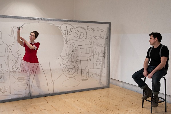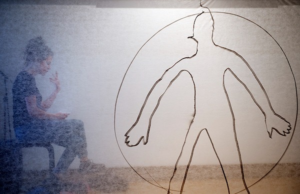Le travail sur le décor et les espaces de projections se réalise toujours en grande complicité avec la scénographe Elissa Bier. Il faut rappeler ici qui il s’agit du montage d’un texte non théâtral ponctué de plusieurs séquences. Avec une comédienne, Sabrina Martin, et un comédien Frédéric Lugon, le défi dramaturgique a été d’échapper tant à la conférence qu’au monologue classique en forme de journal de soi.