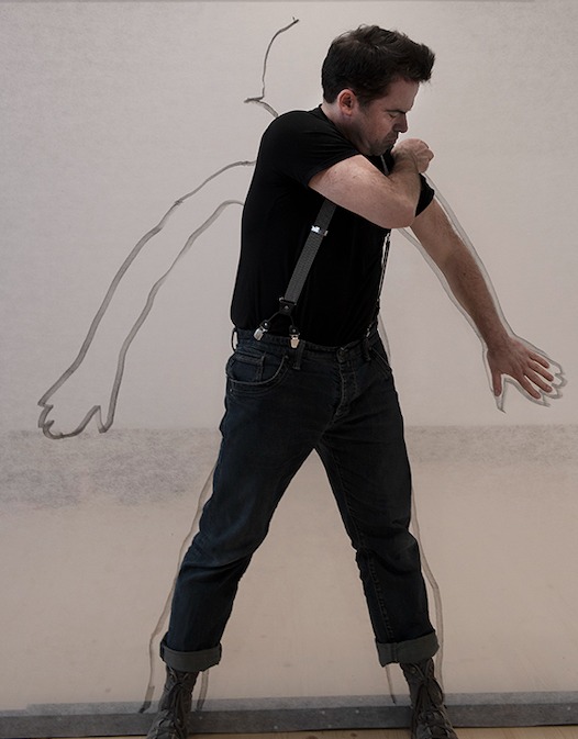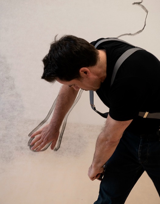 Sur la toile, nous partons de la silhouette dessinée pour mieux nous interroger sur ce qu’est un homme. On peut songer à ces pourtours de corps réalisés au sol pour identification des positions respectives après un accident. Cette surface de signes et dessins nous accompagne ensuite dans la découverte de l’appartement familial de l’écrivain, les figures de Goldorak et Candy...