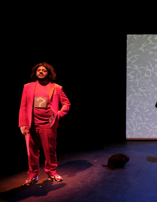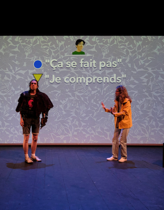 Dans l’élaboration du spectacle, il était très important pour nous qu’elle ne soit pas ce qu’on appelle dans un jeu de rôle un PNJ – soit un personnage entièrement piloté par ordinateur. Les deux personnages sont ainsi successivement placés devant des choix – que tranchent les spectateurs.