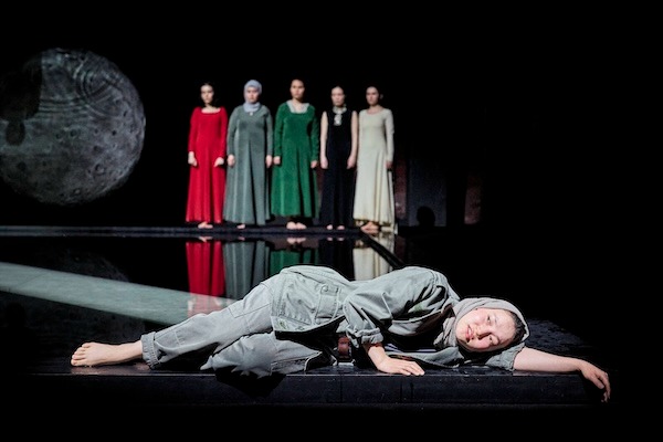 Les comédiennes jouent le spectacle dans une langue belle et chantante, le dari** traduit en français simultanément en projection dans le beau décor composé notamment d’un plan d’eau et de l’image de la lune. Cette langue nous rapproche de Sophocle tout en ouvrant un imaginaire.