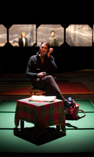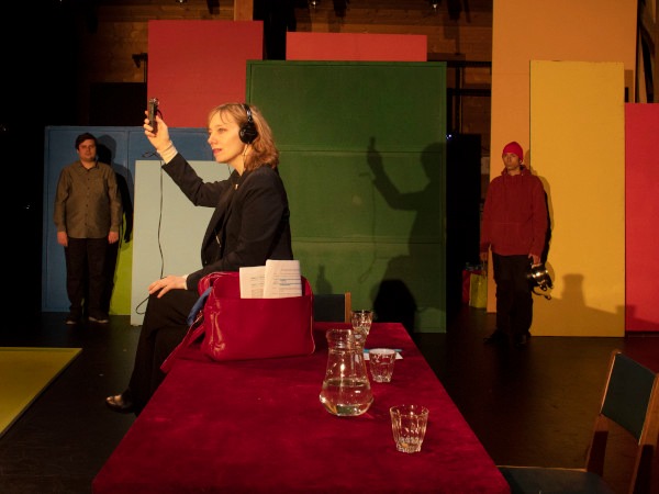 Tout débute pour la pièce en studio de radio autour d’une table effilée affichant le velours rouge des sièges de théâtre à l’ancienne. À partir d’un entretien autour de la mise en scène de Tous les poètes habitent Valparaíso, se déploie un récit choral et multipiste. Il rappelle l’atelier de création radiophonique, mais aussi le podcast. Ubiquistes, mise en scène et scénographie se partagent entre des lieux et temps successifs, alternés. Ils sont suggérés et cadrés par des panneaux aux teintes pastel, ce qui ne surprendront guère les habitué.es de Dorian Rossel et sa Compagnie depuis L’Usage du Monde (2010) d’après l’écrivain Nicolas Bouvier.