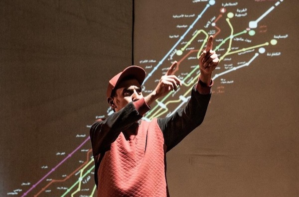Créée en 2011, cette œuvre imaginait un métro à Gaza, symbole de liberté et de mobilité dans un territoire marqué par l'enfermement*. En 2022, Hervé Loichemol, accompagné d'une autrice et de trois interprètes palestinien.nes - dont Ahmed Tobasi - du Théâtre de la liberté de Jénine, adapte cette vision en une pièce racontant l'errance d'une jeune Palestinienne de Haïfa dans ce métro imaginaire, à la recherche d'un homme rencontré en ligne.