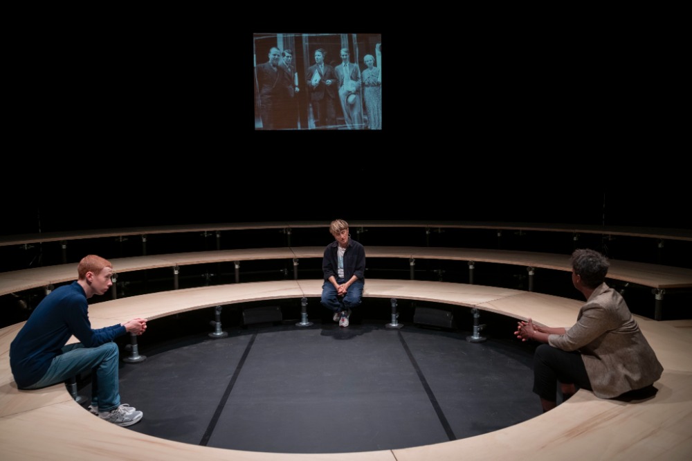 Assis en cercle sur des gradins, le public est convié à une conversation où trois vies réelles se frôlent.