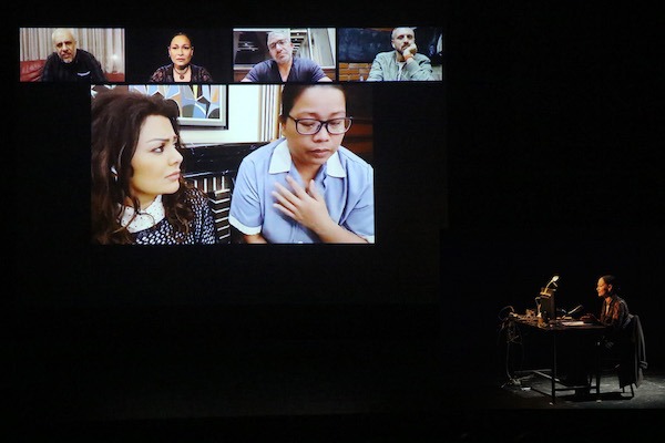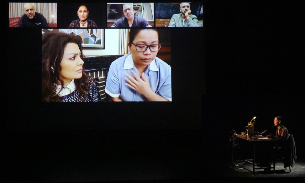 Ce spectacle a été conçu sous forme de meeting Zoom lors du confinement alors que le pays était quasi-fermé. D’où une réalisation vidéo évoquant cette plateforme devenue incontournable pour échanger des points de vue, témoignages et récits entrecroisés. L’idée est de jouer et moduler sur cette plateforme digitale au plateau, ce qui implique des types d’écritures et une forme narrative spécifiques.