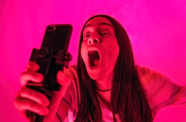 Dès le départ de la pièce, j’ai songé aux propos de Valeska dans son autobiographie, où elle évoque son rapport de frustration au théâtre. Relativement au cinéma et aux possibilités de gros plans sur les expressions du visage, il est frustrant de voir, au théâtre ou en danse, les interprètes si petits et d’aussi loin. Elle a ainsi songé à placer d’immenses loupes sur scène pour découvrir le visage de l’acteur.trice en immense et le détailler. Si ce système n’a pu voir le jour à l’époque, le smartphone aux flux d’images projetées en XXL constitue une manière de réaliser son rêve. À mon avis, elle se serait emparée elle-aussi de cet outil et de ce type de jeu qu’il permet.