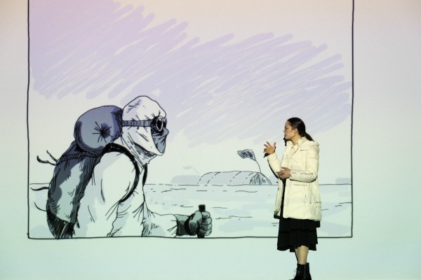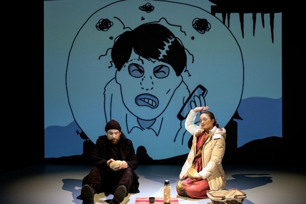 Autour de ce pas de deux entre deux êtres qui ne peuvent se rencontrer véritablement, l’auteure s’attache à une description minutieuse de plats coréens préparés par la narratrice. Cette dernière est issue d’une tradition culinaire transmise par sa mère. En témoigne une scène traitée scéniquement à la manière d’un castelet, sorte de bulle de réalité détachée des images projetées à partir des dessins de Pitch Comment, où elle prépare le célèbre poisson fugu (dont certains organes internes et la peau contiennent une puissante toxine, ndr).