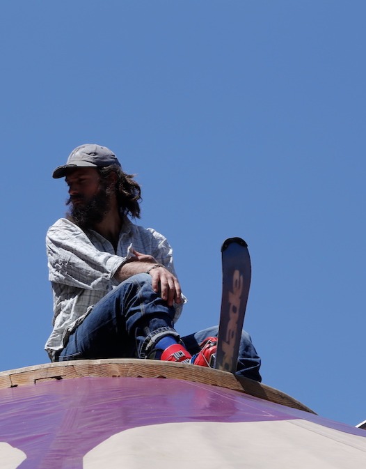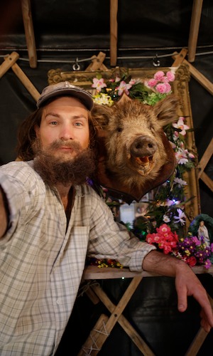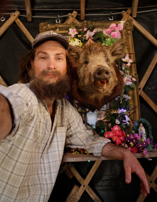 Son personnage de trappeur hirsute semble n’avoir comme seul compagnon d’imaginaire, un sanglier, Napoléon. Du haut de sa longue barbe, l’homme piste sa solitude et ne réalise ses séquences funambules que comme par hasard. L’homme retrouve aussi le sens d’une aventure épique, celle d’une horde de trappeurs disparaissant un à un dans le blizzard.