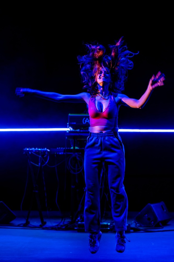 Georges Lini signe la mise en scène de ce texte organique dans lequel le désespoir se mue en infinie beauté. La comédienne est accompagnée par trois musiciens qui déploient une bande-son post-rock bien balancée, changeante et évolutive, au gré de ses états d’âme.