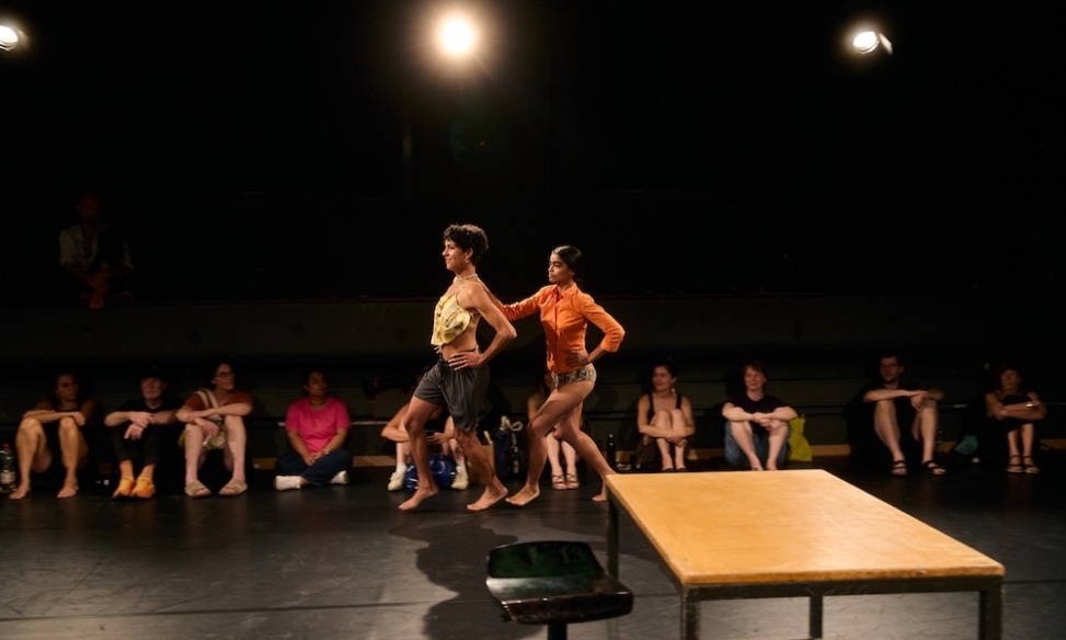 Pensée comme un duo chanté et dansé, deux femmes cisgenres mettent en scène une recherche sur la double contrainte, la métaphore et la contradiction.