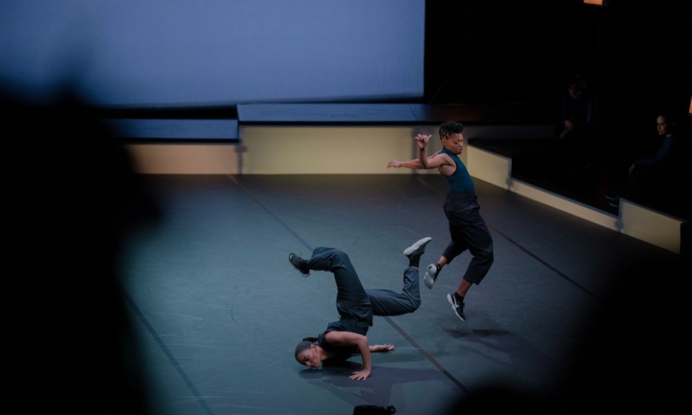 Encadrées par un dispositif d’estrades aux niveaux différents, les interprètes s’éparpillent dans l’espace, se rassemblent. Elles laissent fuguer des solos, des duos merveilleusement secoués.