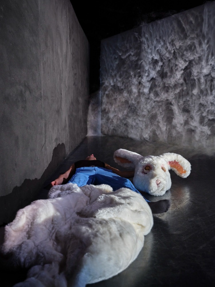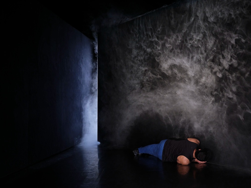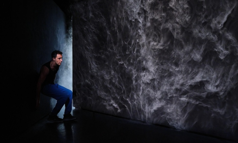 La fumée omniprésente accentue cette confusion et son désir de s’échapper. Coincé entre deux murs en perspective et exposé devant un public, l’homme cherche à travers le mouvement une issue à son dilemme. Une scénographie ingénieuse permettant le contrôle de la fumée.
