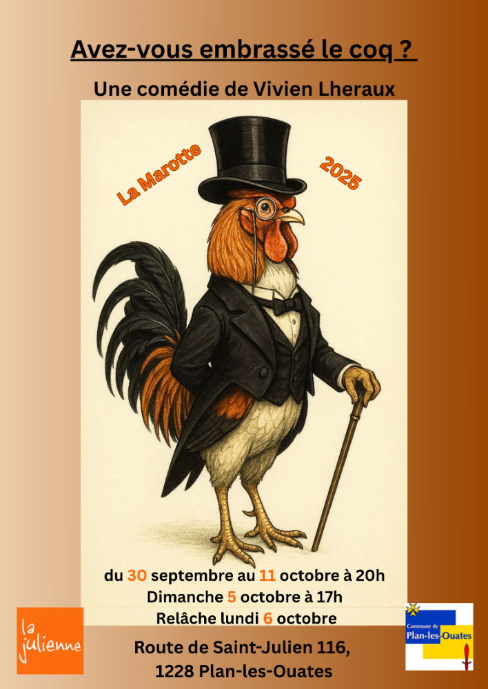Avez-vous embrassé le coq?, une comédie de Vivien Lheraux à découvrir du 30 septembre au 11 octobre 2025 à La julienne, Plan-les-Ouates.