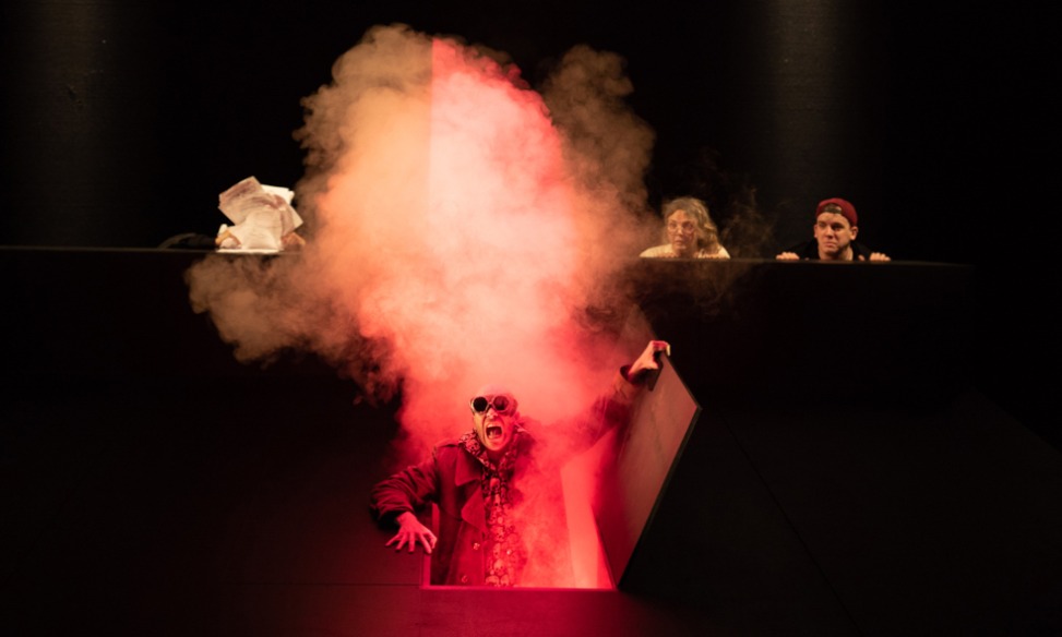 Ce trésor se trouve, il en est sûr, au pied d’un arc-en- ciel. Sur scène, il y a une course-poursuite, un drôle de tribunal, le fameux arc-en-ciel – pas une vidéo ou un dessin, mais bien un véritable arc-en-ciel ! –, des chants, et huit comédiennes et comédiens aux prises avec une histoire rocambolesque.