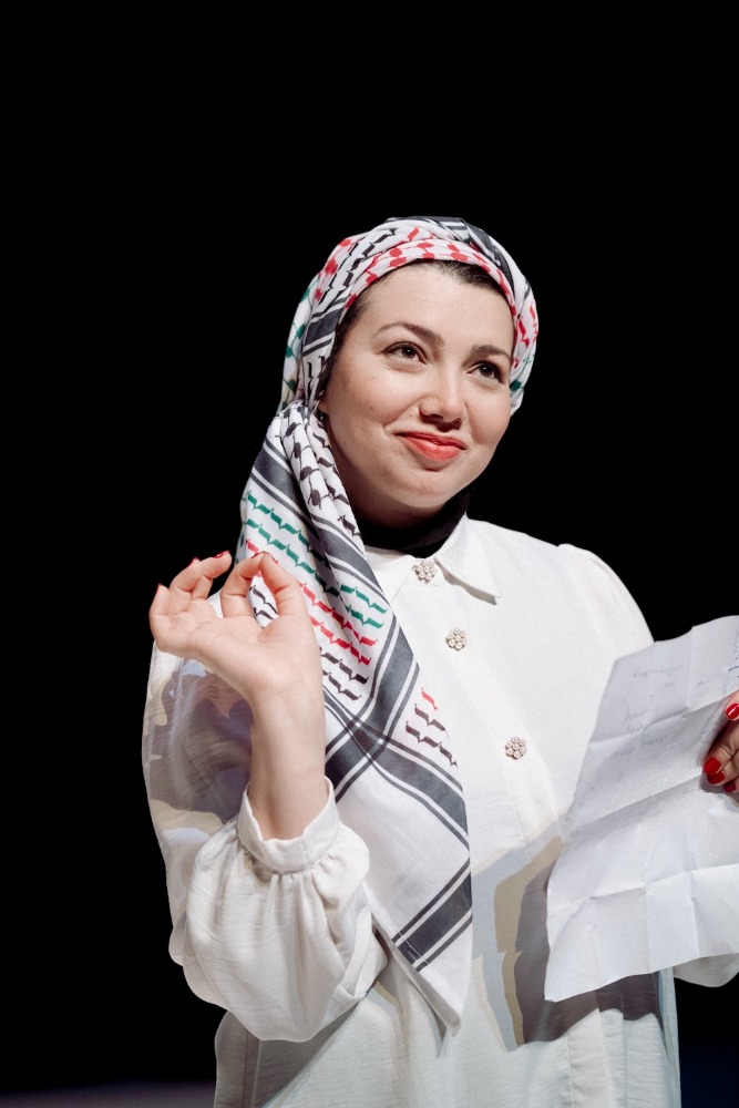 Sur scène, la poètesse gazaouie Hend Jouda lit ses textes en arabe et semble comme suspendue entre la lumière des poèmes et de sa voix, un détachement nourrit d’ironie, et sa présence intense.