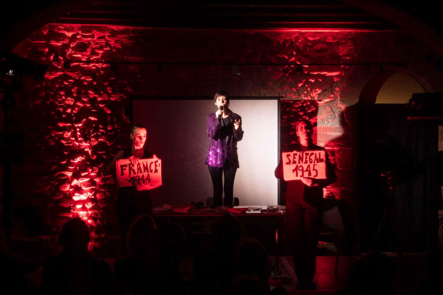 Sur scène, une troupe répète un spectacle dans un décor de plateau télé qui accueillera une présentatrice et des invité-e-s pour témoigner, débattre et rendre hommage aux actrices et acteurs majeur-e-s de cette lutte de plus d’un siècle pour accéder au droit de vote et d’éligibilité.