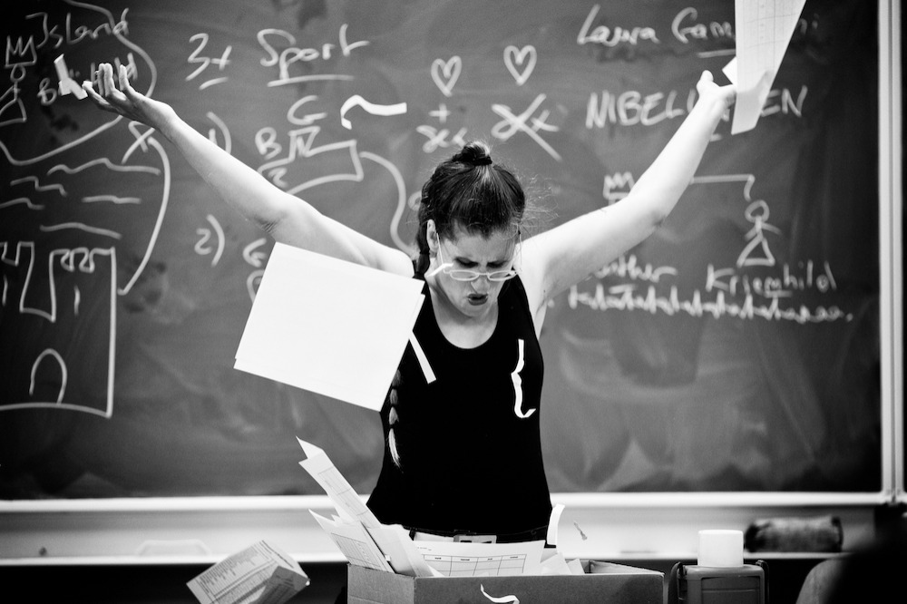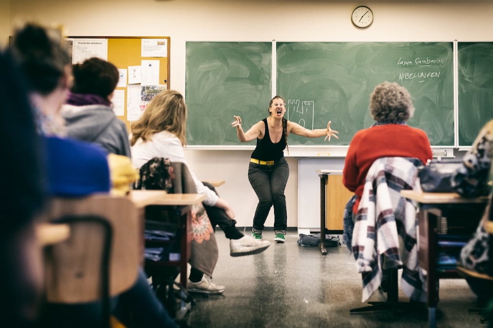 Imaginez-vous, un soir, vous vous faufiler dans une école, peut-être même votre ancienne école. Attablée ou affalé à un pupitre un peu trop petit pour vous, vous assisteriez à une leçon d’allemand délirante.
