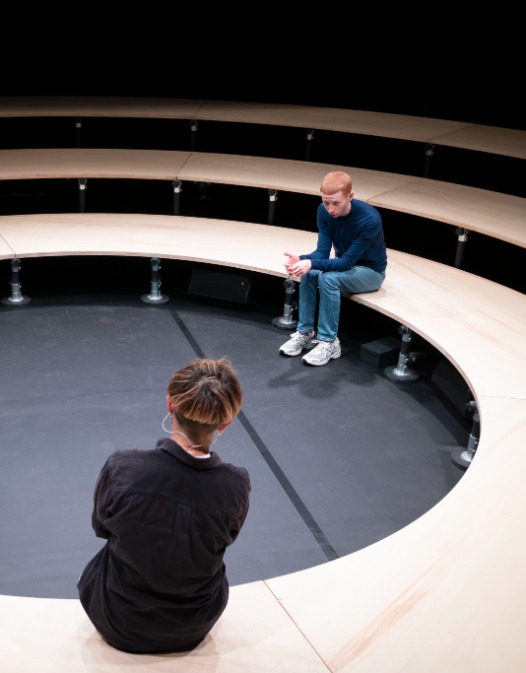 Assis en cercle sur des gradins, le public est convié à une conversation où trois vies réelles se frôlent.