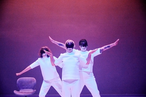 Amplifiées, nos voix au plateau sont modifiées, triturées, amenées dans les aigus ou les graves. Cela rejoint le fait la fait de jouer des doubles robotiques de nous-mêmes derrière des masques stylisés. Nous nous amusons avec ce matériau que dessinent les voix trafiquées et l’Auto-tune.