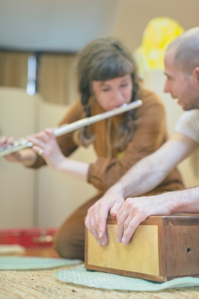 Elisabeth de Merode, concept, flûte, chant - Lucas Duclaux-Loras, percussions, voix - Olivia Boa, aide à la scénographie, artiste visuelle spécialisée en neurologie- Catherine Giacobino, spécialiste de la petite enfance
