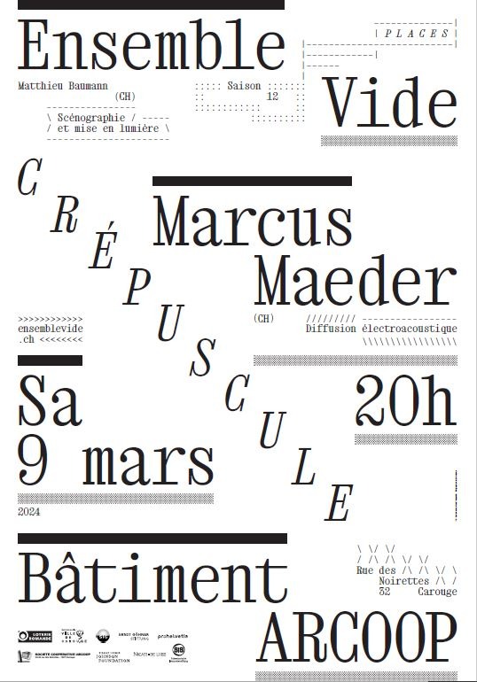Crépuscule, une proposition électroacoustique de Marcus Maeder à découvrir le 9 mars 2024 au Bâtiment ARCOOP, Carouge.