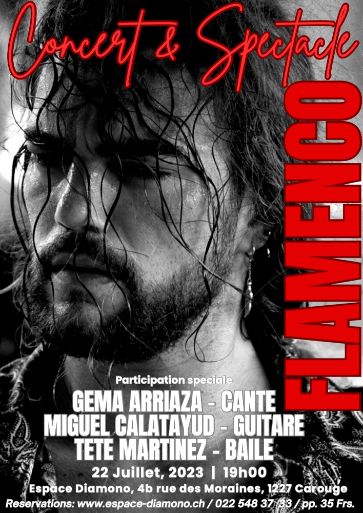Toute la force et la subtilité de la voix de Gema pour inspirer la danse de Tete Martinez, accompagnés à la guitare par Miguel Calatayud. Voilà le magnifique programme de cette soirée de tablao flamenco, à voir absolument! Participation: 35 chf pp, les places places étant limitées nous vous remercions de bien vouloir réserver. Information et réservation: info@espace-diamono.ch tel: 022 548 37 33