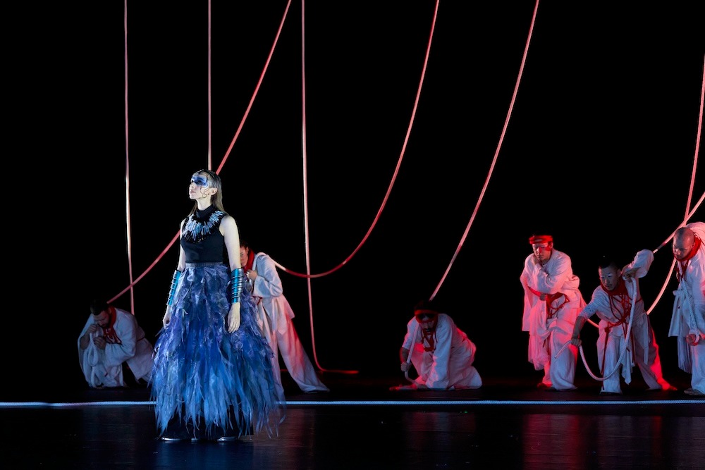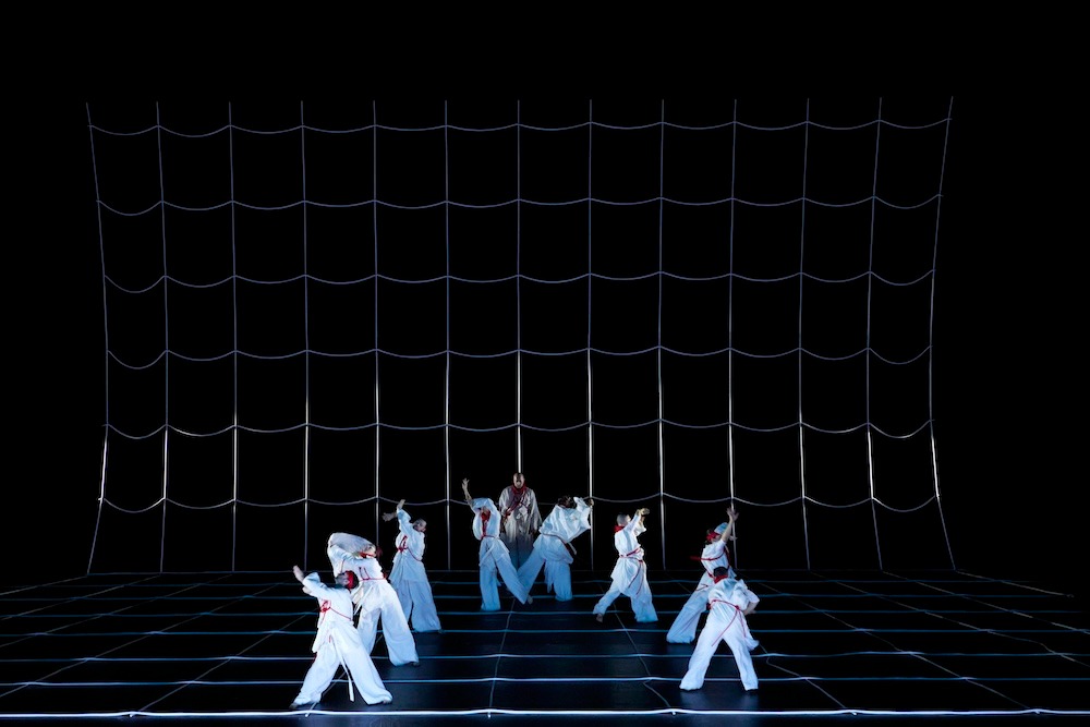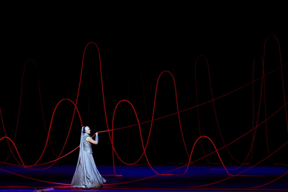 Le fil et ses avatars – cordes, câbles, lacets et filins – sont la marque de fabrique de la plasticienne japonaise Chiharu Shiota, qui signe la scénographie de cette production. Le plus souvent de couleur rouge, car le fil rouge est un talisman karmique puissant au Japon et dans les pays d’Asie de l’Est. Elle en tisse performances, art corporel et installations dans un processus protéiforme explorant la temporalité, le mouvement, la mémoire et le rêve, exigeant l’implication à la fois mentale et corporelle du spectateur.