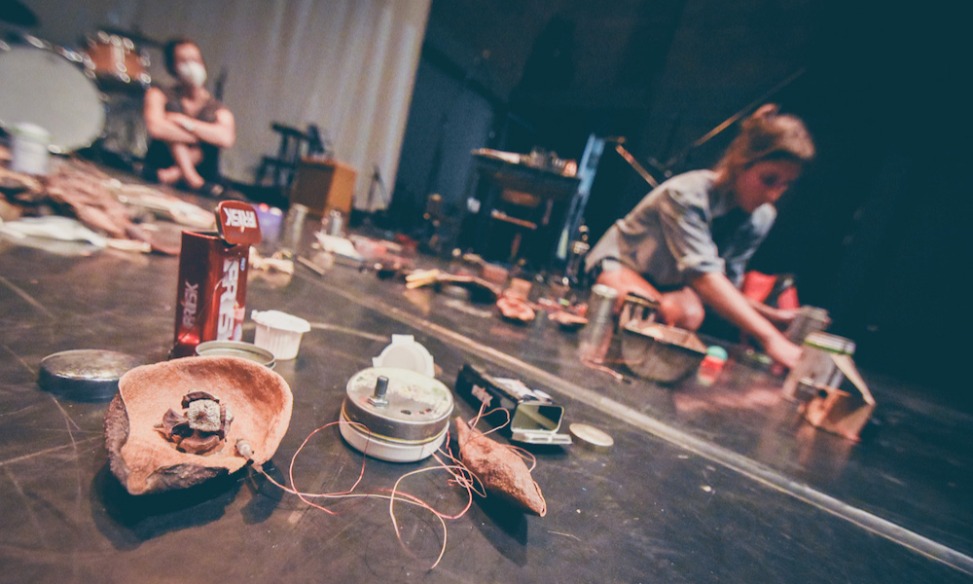 Living Objects, c’est une fourmilière: boîtes de conserves, sifflets à roulettes, amortisseurs de locomotives, couvercles de compresseur, balles de ping-pong, feuilles d’agave sèches, éponges, fils d’acier, branches, feuilles de papier ou sachets en plastique s’animent et font découvrir des mondes sonores, tout autant que visuels.