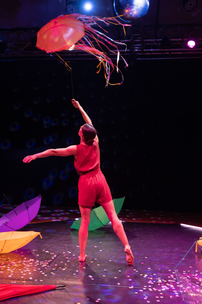 De parapluie en parapluie, différents récits s’écoulent, laissant apparaître un arc-en-ciel d’émotions. Dans ce spectacle immersif et intimiste, danse, musique et lumière s’entremêlent et créent un univers tout en douceur adapté aux tout-petit·es.