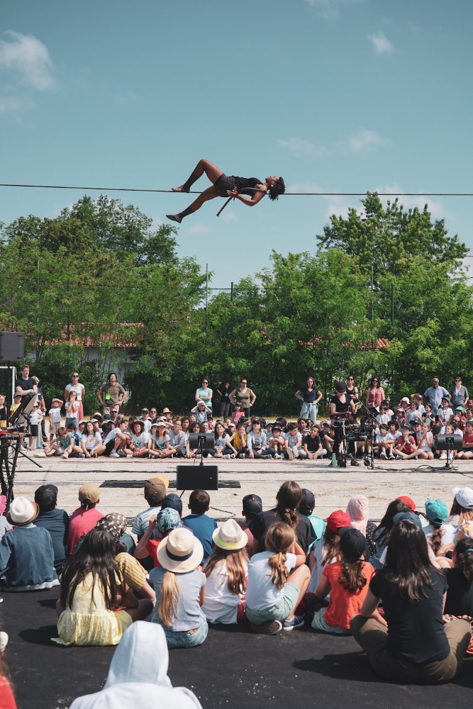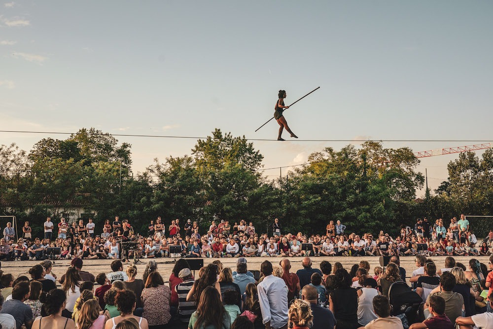 Portée par la musique jouée en direct, une funambule évolue sur un fil à plus de 4 mètres de hauteur pour une traversée dansée. Le public participe à la levée de la structure, accompagne l’artiste dans sa progression...