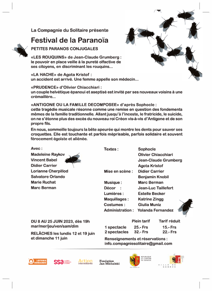 Quatre textes autour de la paranoïa proposés par Didier Carrier (Cie du Solitaire) et Benjamin Knobil (Cie Nonante-Trois) pour un doux mélange de tragique et de comique pour dévoiler diverses facettes de cette folie particulière.