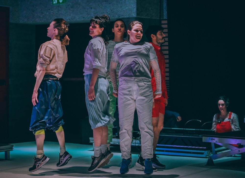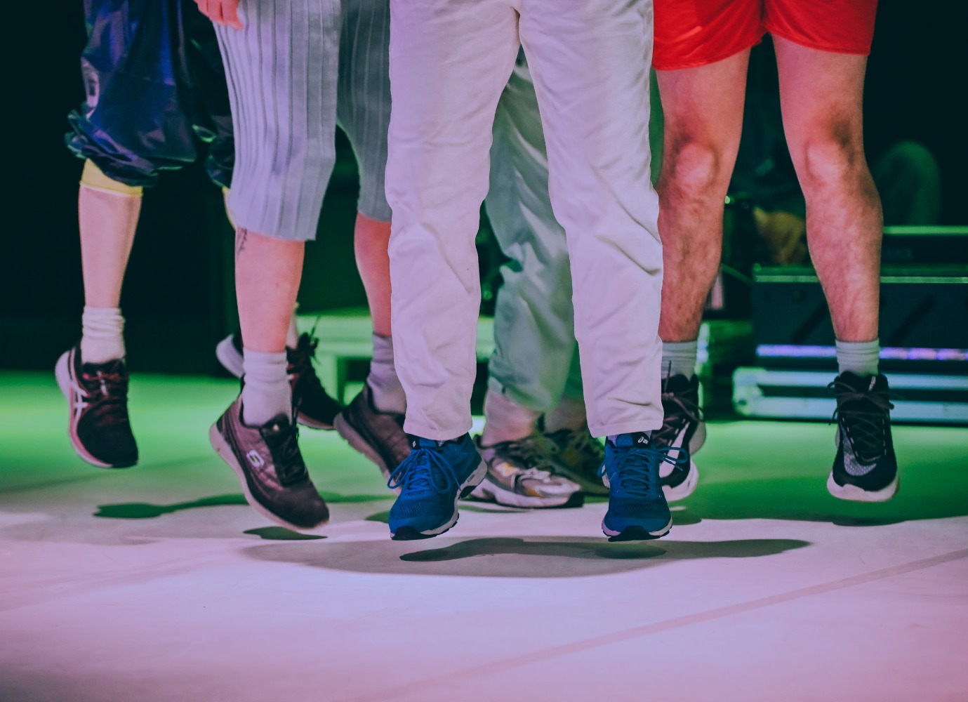 Pour tout faire sauter. Pour affirmer la joie. Dans le but de tisser des liens entre toutes choses : les interprète·x·s, les murs, la bière dans nos verres, les amibes, les spectateur·ice·x·s, l’air, les chat·te·s, les oublié·e·x·s, les téléphones portables, l’acier, l’invisible, le pouvoir, le râle, nos basquettes, l’amour, les blobs...
